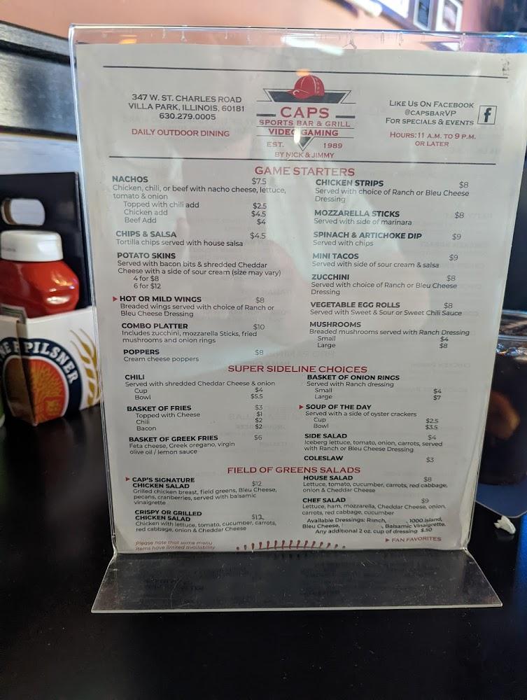 Welcome to Caps Sports Bar & Grill, your go-to destination for great food and drinks in Villa Park! Located at 347 St Charles Rd, we offer a relaxed atmosphere perfect for lunch, dinner, or solo dining. Enjoy a diverse menu featuring traditional grill favorites, along with an impressive selection of cocktails and beers, all at affordable prices. Our amenities include a spacious patio, quick service, and wheelchair accessibility, ensuring everyone can join the fun. Don't miss our exciting quiz nights and sports screenings! For a casual dining experience with excellent service, visit Caps Sports Bar & Grill today!
